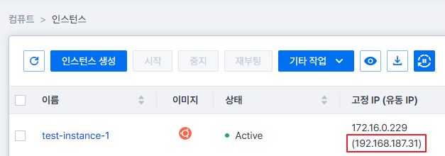 컴퓨트 > 인스턴스 메뉴에서 인스턴스의 유동 IP 주소를 확인합니다.