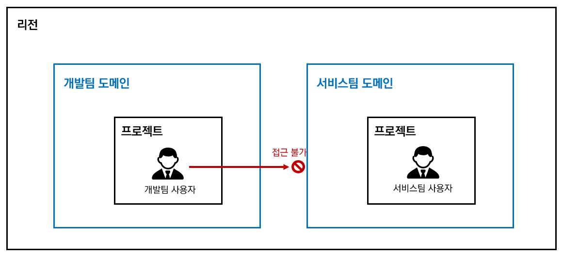 도메인은 독립적인 인증과 권한이 적용됩니다. 예를 들면, 아래 그림에서 개발팀 도메인에 속한 사용자는 서비스팀 도메인에 로그인하거나 자원을 설정할 수 있는 권한이 없습니다.