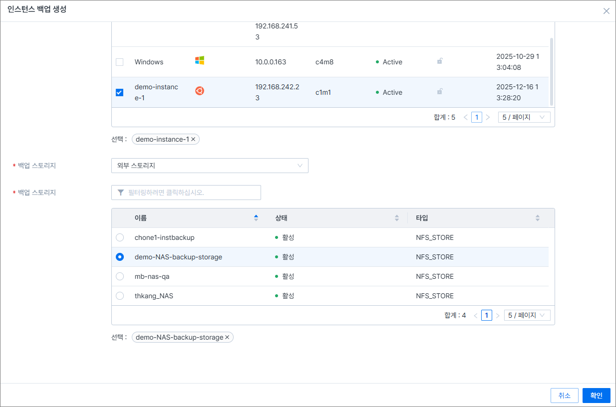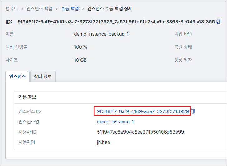 demo-instance-backup-1이라는 이름의 인스턴스 백업이 생성됩니다.