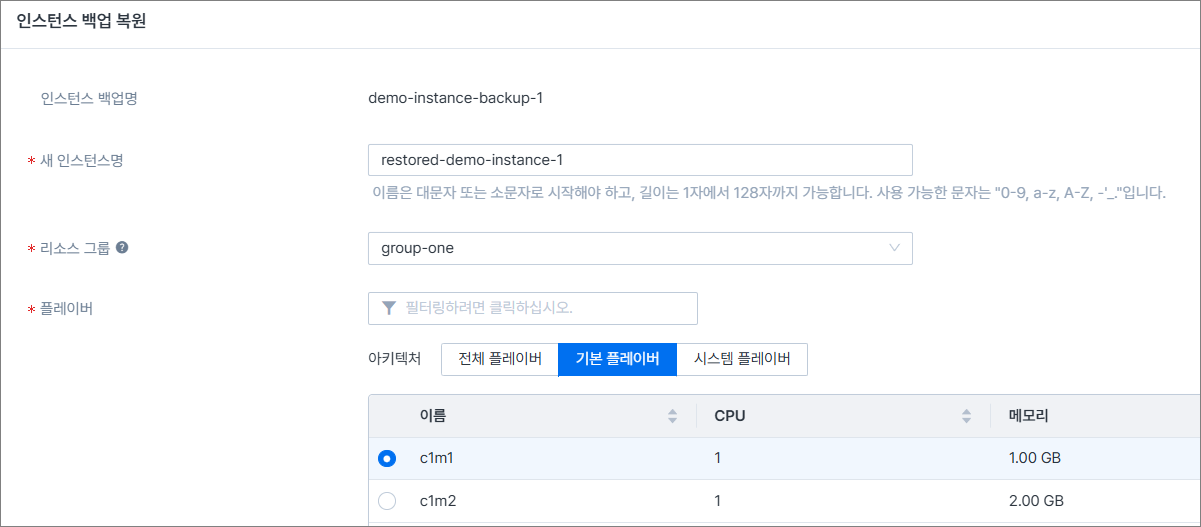 <인스턴스 백업 복원> 창이 출력됩니다. 설정 예시는 다음과 같습니다.