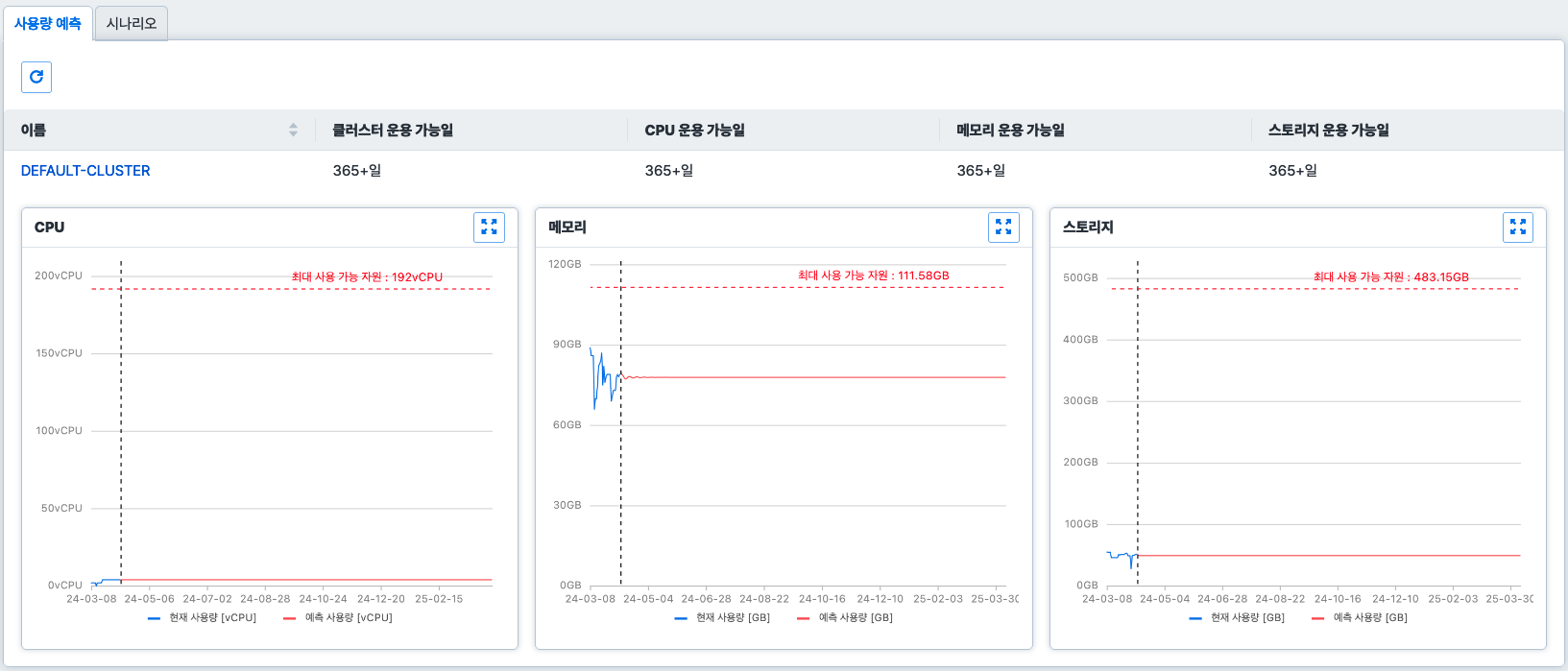| 클러스터/CPU/메모리/스토리지 운용 가능일 | 현재와 같은 추세로 자원 사용 시, 클러스터 운용이 가능한 기간 |