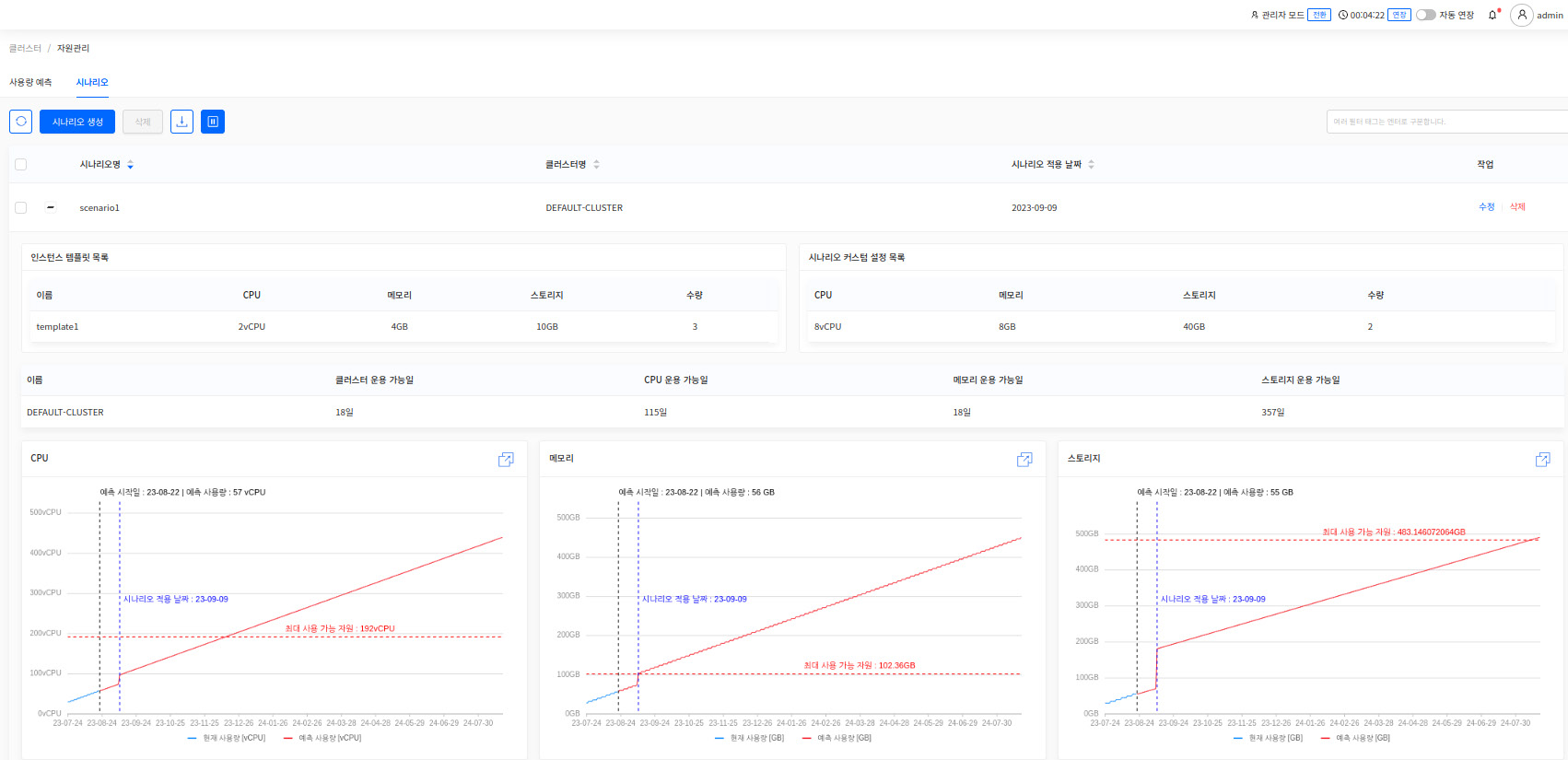 관리자 모드 > 클러스터 > 자원관리 > 시나리오를 클릭하면 다음과 같은 그래프가 출력됩니다.