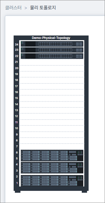 물리 토폴로지(Physical Topology)는 물리적인 랙(Rack)에 설치된 POPCON HCI 형상을 시각화하여 보여주는 기능입니다. 이를 통해 물리 호스트와 스위치 정보를 한 눈에 확인할 수 있습니다.
