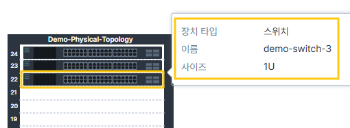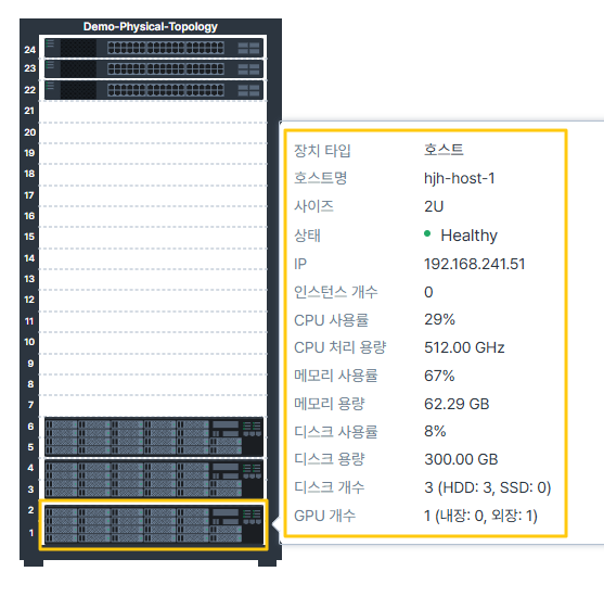 마우스 포인터를 장비 이미지 위에 올리면 다양한 상태 정보가 출력됩니다. 또한 랙, 호스트, 스위치 장치를 토폴로지에 추가하거나 삭제할 수 있습니다.