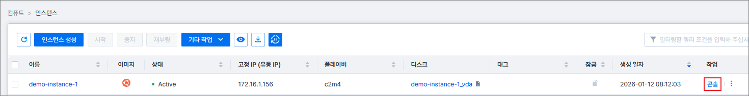 인스턴스 생성이 완료되면 콘솔 기능을 통해 인스턴스에 접속할 수 있습니다.